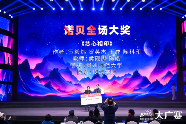全場大獎是大廣賽最高獎項,經過全國總評審的評委投票、評議,從10個作品類別中評選出4組備選作品。現場通過作品展示、闡述要點、評委點評、現場投票等環節,最后由大廣賽資深評委投票決出全場大獎得主。經過現場激烈角逐和尖峰對決,貴州師范大學傳媒學院的王毅煒、賀英杰、王成、陳科印同學以作品科大訊飛命題微電影作品《芯心相印》的超凡創意與優秀舞臺表現力,贏得評委和現場觀眾的一致好評,最終獲得第16屆大廣賽全場大獎。