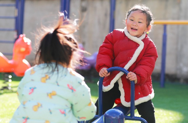 冬日暖陽下,中路幼兒園孩子在玩蹺蹺板。