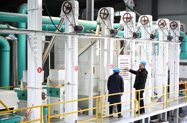 2025年1月10日,“95后”返鄉創業大學生任宏宇(右)在陜西省榆林市米脂縣米森農業發展有限公司的生產車間與工人交流設備運行情況。新華社記者張博文 攝
