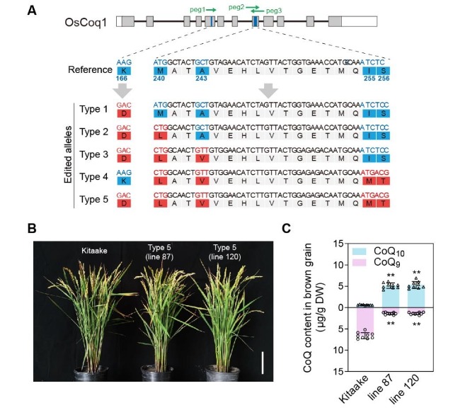 結合對1000多種陸生植物輔酶Q側鏈合成酶Coq1氨基酸序列的進化分析和機器學習,科研團隊最終確定了決定鏈長的5個氨基酸位點。再通過精準的基因編輯,創制了主要合成輔酶Q10的水稻。實際種植表明,水稻的生長和產量均未受影響。
