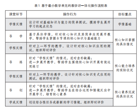 在上述教學范式下,圍繞教學目標,根據課堂教學過程中不同階段的目標重心形成不同的教學單元,進而匹配組織實施相應的即時形成性評價,從而實現“教學評一體化”基于最小教學單元形成運行閉環,讓課堂在一“節”一“評”的節奏中逐步進階,穩步推進。