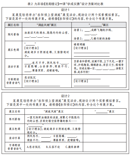 三是評價實施注重貫通和進階,確保導向性。教學評一體化中的評價是整個教學流程中的重要一環,而教學流程絕不會是平鋪直敘的。順應課堂教學的邏輯與學生思維的規律,教學流程會有一個由表及里、由低到高、由直觀到抽象、由淺近到深層、由單一到綜合的變化過程;緊貼不同課堂教學單元的評價反饋也必須與不同的教學階段相匹配,以順應教學流程的發展脈絡,實現首尾貫通,逐步進階,引導教學走向課堂教學目標的最終達成。上述提到的兩個例子中,例1在課文中關鍵漢字的識字學習后進行反饋,是教學進程中對核心知識的評價,屬于“導學”單元初級的“學程反饋”。例2則是在古文誦讀與解析的基礎上,設計了真實情境來對核心知識加以運用。同時,基于學生對古文的理解,轉換閱讀理解的角度,借助“設計展區色調”這個任務來考查學生對文章渲染的氣氛的感知與表達,體現對綜合運用與審美素養的關注,屬于課堂“導創”單元高階的“學成反饋”。