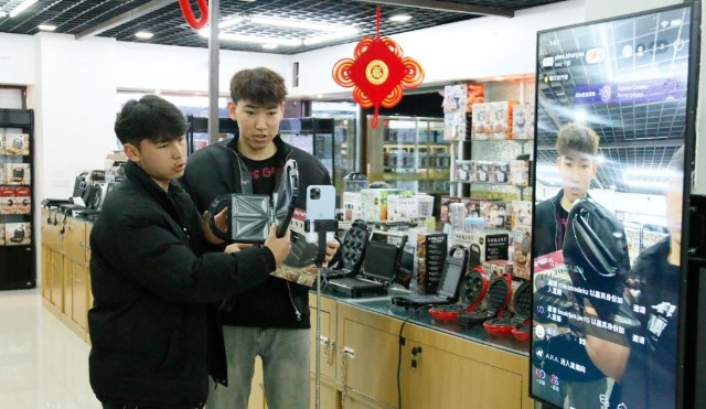 2月18日,在中哈霍爾果斯國際邊境合作中心的義烏國際商貿城里,跨境電商主播向中亞消費者介紹中國商品。(馬婷婷 攝)