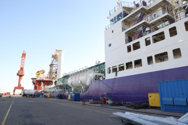 1月2日,大連船舶海洋工程有限公司廠區內碼頭上,一輛LNG運輸卡車正在為“北極探路者”運輸船進行保稅LNG燃料加注。