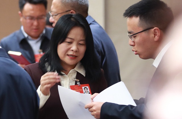 3月9日,全國人大代表、云南省曲靖市第二小學校長李青霖(左)與小組工作人員交流。