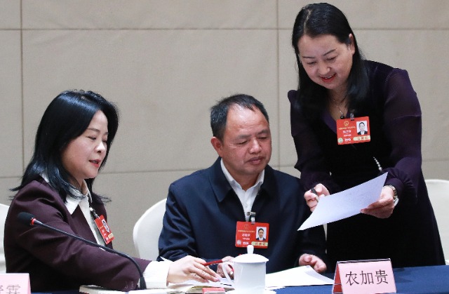 3月9日,李青霖(左)農加貴(中)、甄蘭芳3位代表在一起討論交流。