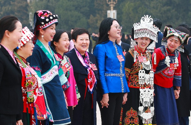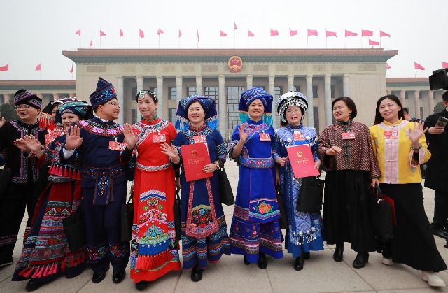 十四屆全國人大三次會議11日下午3時在人民大會堂舉行閉幕會。圖為貴州代表團(tuán)部分代表進(jìn)場前獻(xiàn)歌。中國教育報-中國教育新聞網(wǎng)記者 張學(xué)軍 攝