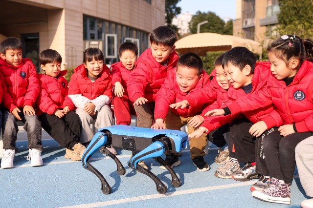 2025年1月2日,浙江省寧波市江北區甬港幼兒園的孩子們在科普活動現場與機器人互動。新華社記者 江漢 攝
