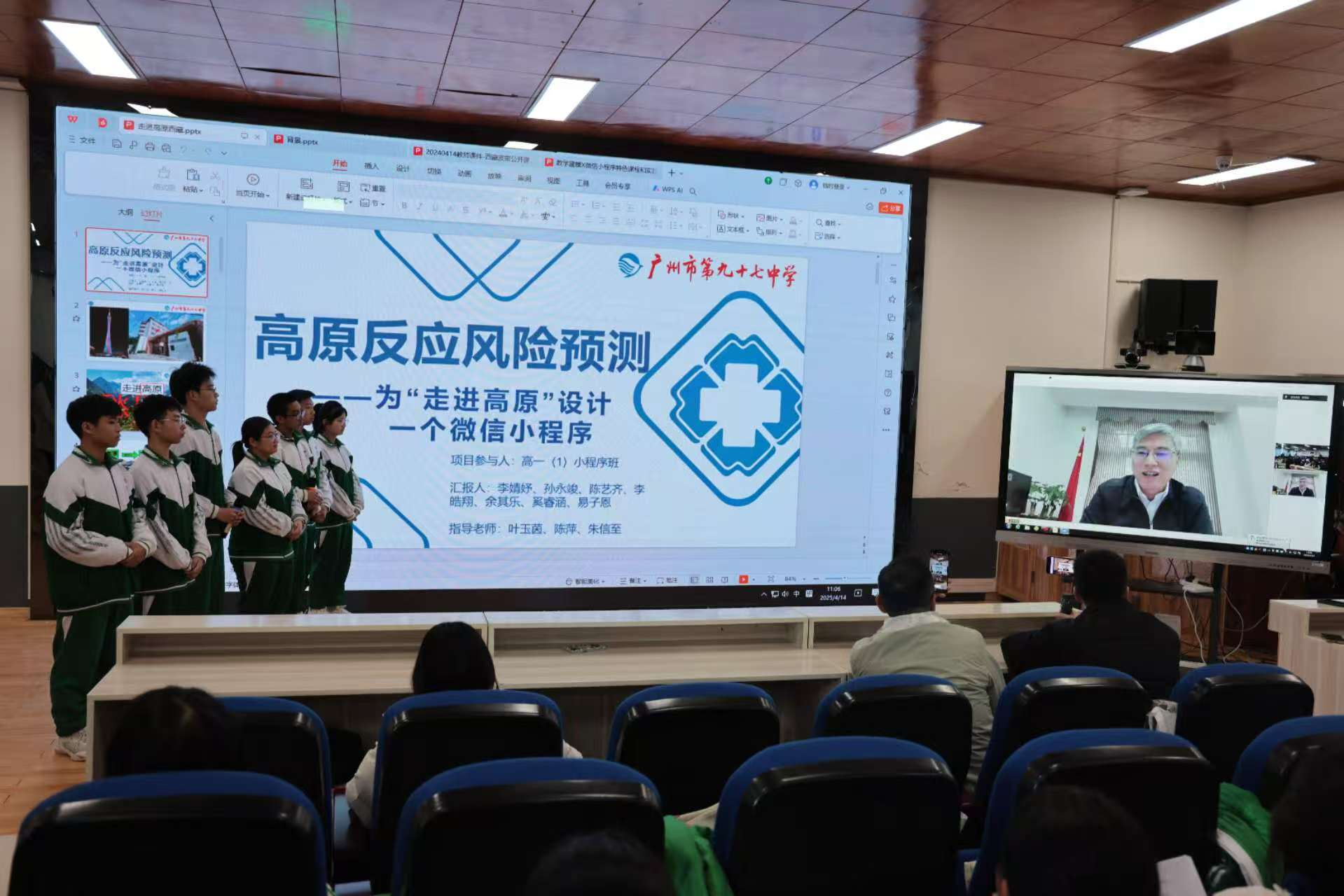 活動中,廣州97中學生介紹了他們借助AI工具,設計、制作的“高原反應風險預測”小程序。四川大學華西醫院院長、高原醫學中心主任羅鳳鳴教授通過視頻連線在線指導,對這群高中生做的小程序作出了點評。