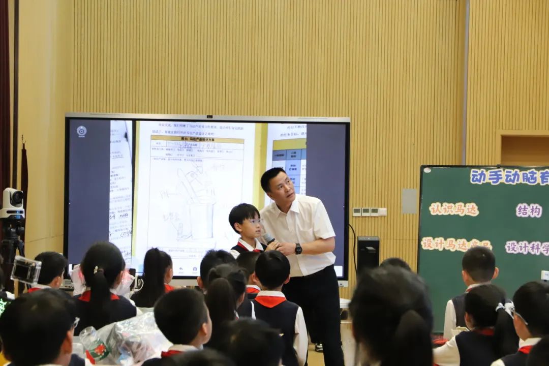 在教學展示環節,浙江省平湖市乍浦天妃小學教師高建指導學生優化馬達產品的設計。學校供圖