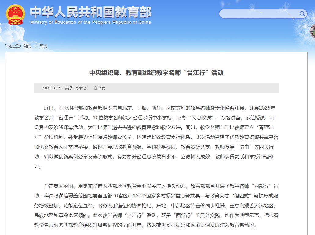 近日,中央組織部和教育部組織來自北京、上海、浙江、河南等地的教學(xué)名師赴貴州省臺江縣,開展2025年教學(xué)名師“臺江行”活動。10位教學(xué)名師深入臺江多所中小學(xué)校,舉辦“大思政課”、專題講座、示范授課、同課異構(gòu)及診斷課等活動,為當(dāng)?shù)貛熒腿ハ冗M(jìn)的教育理念和教學(xué)方法。同時,教學(xué)名師與當(dāng)?shù)亟處熃ⅰ扒嗨{(lán)結(jié)對”幫扶機(jī)制,并受聘為臺江特聘教師或校長,構(gòu)建起長效教育支持體系。此次活動搭建了優(yōu)質(zhì)教育資源共享平臺和優(yōu)秀教育人才交流橋梁,通過開展思政教育領(lǐng)航、學(xué)科教學(xué)提質(zhì)、教育資源共享、教師發(fā)展“造血”等四大行動,輔以微創(chuàng)新案例分享交流等形式,有力提升臺江思政教育水平、立德樹人成效、教師隊伍素質(zhì)和學(xué)校治理能力。