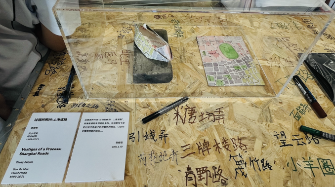 活動(dòng)現(xiàn)場,藝術(shù)家張健君邀請(qǐng)學(xué)生們和他共同創(chuàng)作,寫下記憶中最美的但已經(jīng)消失的上海街道的名字,或者他們喜歡的街道的名字,用獨(dú)特的藝術(shù)方式記錄城市記憶。