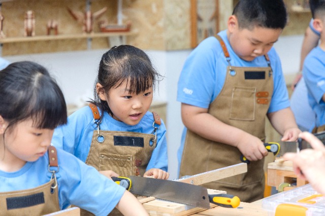 活動當日,陽光灑進揚州工業職業技術學院木工實踐基地,古樸的斧、鋸、刨、鑿等工具整齊排列。在專業教師的耐心指導下,孩子們從認識工具的名稱、用途和使用方法開始,逐步開啟木工實踐之旅。手握鋸子切割木料時,許多孩子因力度把控不好而讓鋸齒偏移,但他們沒有放棄,在“穩、準、慢”的口訣引導下反復嘗試。當第一塊平整的木板成功切割完成,孩子們歡呼雀躍,眼中滿是自豪。在拼接環節,有同學發現直角拼接存在縫隙,積極思考,在老師的啟發下,利用木楔加固,最終實現了嚴絲合縫的效果。