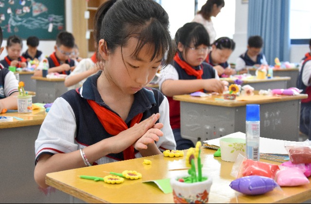 7月4日,鹽城市大慶路實驗學校暑托班學生在上手工課。
