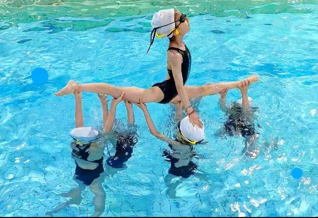 7月4日,鹽城市解放路實驗學校暑托班學生在進行水中劈叉托舉訓練。