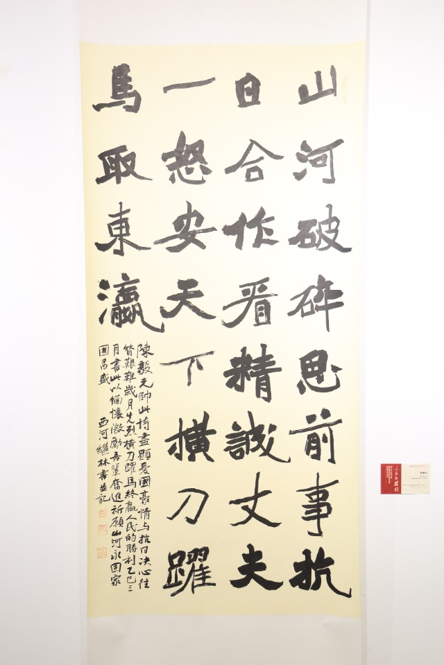 本次書法展以“銘記”為起點、“奮進”為歸旨,匯集由教育界著名書法家、高校書法專業教師及中小學一線教師創作的近300幅書法作品,深切緬懷為國家和民族捐軀的革命先烈,深情傳頌偉大的抗戰精神。展覽還特別展出了聯合國前秘書長潘基文先生于2012年在任期間,在周斌指導下書寫的首幅書法作品《和平》,充分體現了中國人民和世界人民一道向往和平、倡導人類命運共同體的理念。展覽展出時間將從9月6日持續到9月19日。
