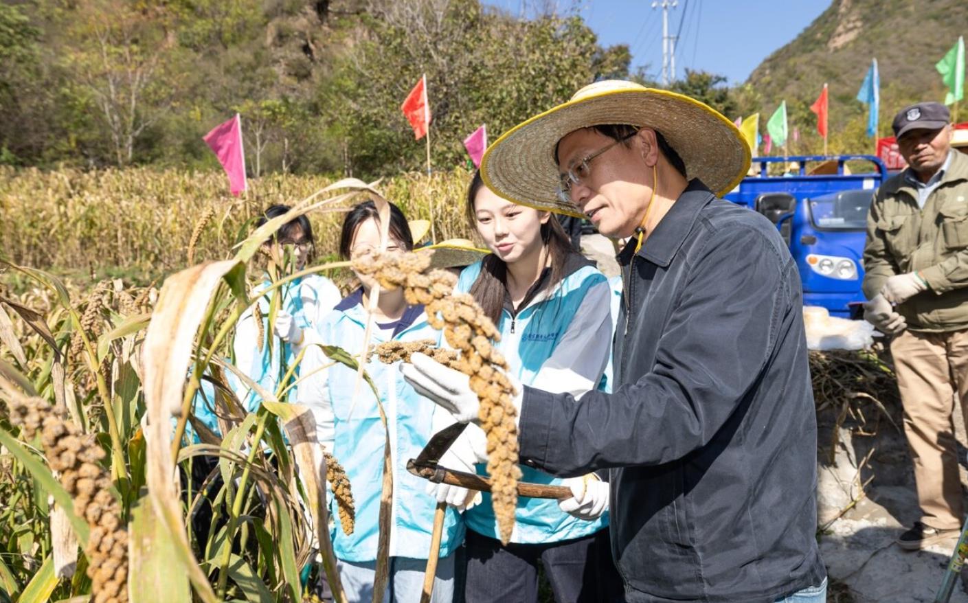 北京聯合大學黨委書記楚國清指導同學們如何收割谷子并講授農作物知識。學校供圖