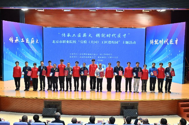 11月4日,北京市職業(yè)院?!皠谀#ù髧┕そ尺M(jìn)校園”活動中,10名北京科技職業(yè)大學(xué)的學(xué)生為10位勞模工匠頒發(fā)“班級工匠導(dǎo)師”聘書。北京科技職業(yè)大學(xué)供圖