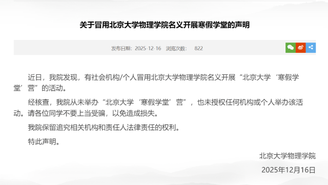 北京大學:社會機構/個人冒用其物理學院名義開展寒假學堂2025年12月16日,北京大學物理學院發布聲明,有社會機構/個人冒用北京大學物理學院名義開展“北京大學‘寒假學堂’營”的活動。經核查,北京大學物理學院從未舉辦“北京大學‘寒假學堂’營”,也未授權任何機構或個人舉辦該活動。請各位同學不要上當受騙,以免造成損失。