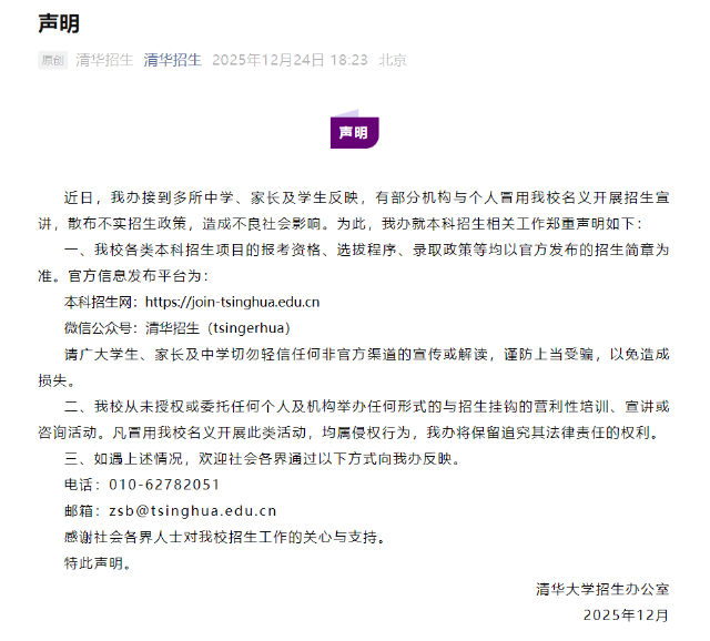 清華大學:部分機構與個人冒用學校名義開展招生宣傳2025年12月24日,清華大學招生辦發布鄭重聲明。強調清華大學各類本科招生項目的報考資格、選拔程序、錄取政策等均以官方發布的招生簡章為準,具體需關注清華招生微信公眾號或本科招生網。清華大學從未授權或委托任何個人及機構舉辦任何形式的與招生掛鉤的營利性培訓、宣講或咨詢活動。
