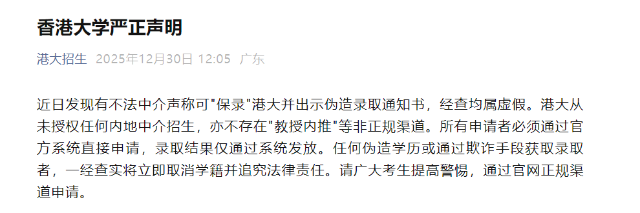 香港大學:有不法中介聲稱可“保錄”港大2025年12月30日,?香港大學?通過“港大招生”發布嚴正聲明,近日發現有不法中介聲稱可“保錄”港大并出示偽造錄取通知書,經查均屬虛假。港大從未授權任何內地中介招生,亦不存在“教授內推”等非正規渠道。所有申請者必須通過官方系統直接申請,錄取結果僅通過系統發放。任何偽造學歷或通過欺詐手段獲取錄取者,一經查實將立即取消學籍并追究法律責任。