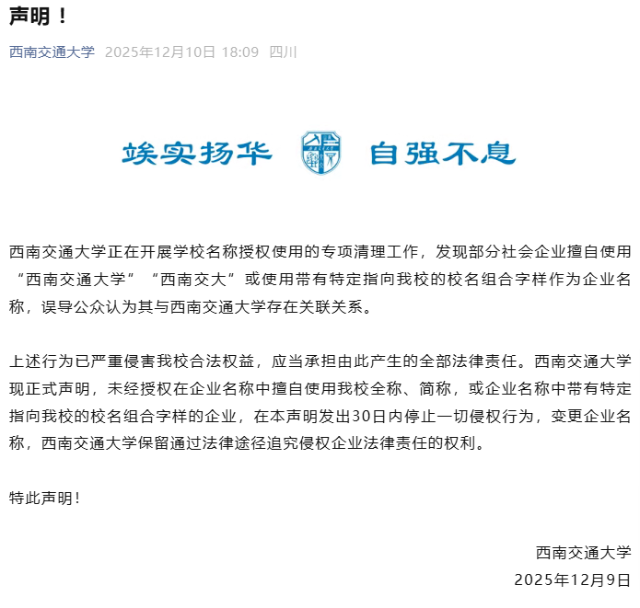 西南交通大學:部分企業擅自使用校名2025年12月9日,西南交通大學發布聲明稱,該校正在開展學校名稱授權使用的專項清理工作,發現部分社會企業擅自使用“西南交通大學”“西南交大”或使用帶有特定指向該校的校名組合字樣作為企業名稱,誤導公眾認為其與西南交通大學存在關聯關系。學校稱,上述行為已嚴重侵害該校合法權益,應當承擔由此產生的全部法律責任。