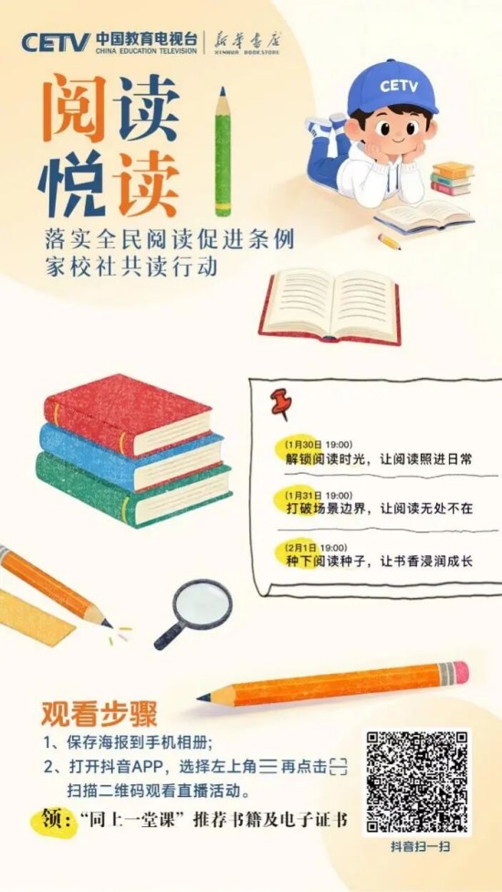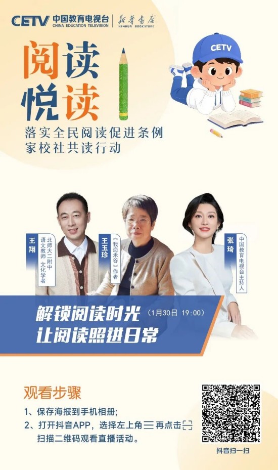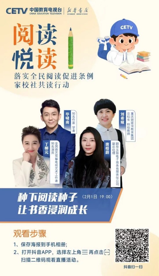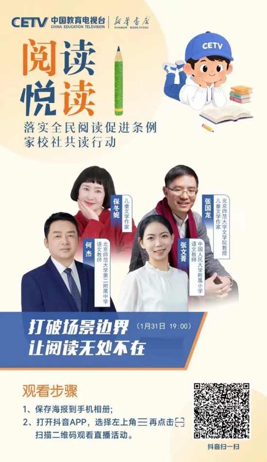 為推動條例有效落地、培養廣大青少年更好地閱讀,在教育部基礎教育司指導下,中國教育電視臺聯合人民教育出版社、新華書店總店,特邀閱讀推廣人、閱讀領誦人、閱讀分享人等,共同開啟“落實全民閱讀促進條例 家校社共讀行動”全媒體直播活動。這不僅是對條例精神的踐行,更是對“讀書破萬卷,下筆如有神”的文化傳承,是為青少年搭建與先賢對話、與自我對話、與世界對話的精神橋梁。