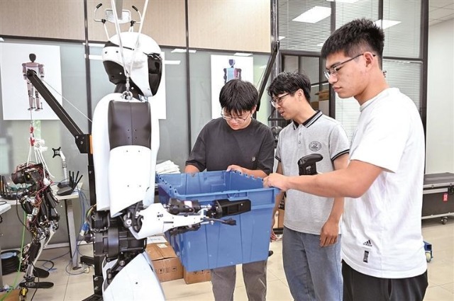 華中科技大學機械科學與工程學院內,研究人員對人形機器人進行搬運測試。新華社發