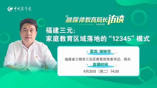 9月20日14:30,中國教育報融媒體教育局長訪談,我們邀請福建省三明市三元區教育局黨委書記、局長謝映華做客直播間,分享做好家校共育的“三元模式”。