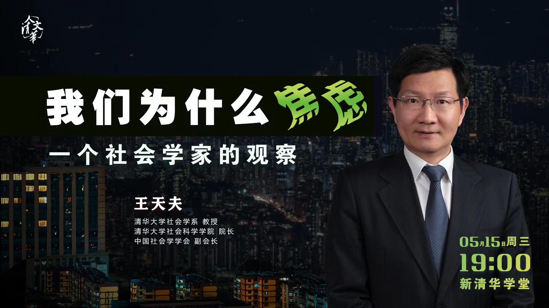 5月15日19:00,人文清華講壇,清華大學社會科學學院院長王天夫將從社會學角度解析焦慮的根源,解答“我們為什么焦慮”的時代之問,揭示社會變遷對人的影響,幫助我們理解自我、理解社會,重獲平衡與安寧。