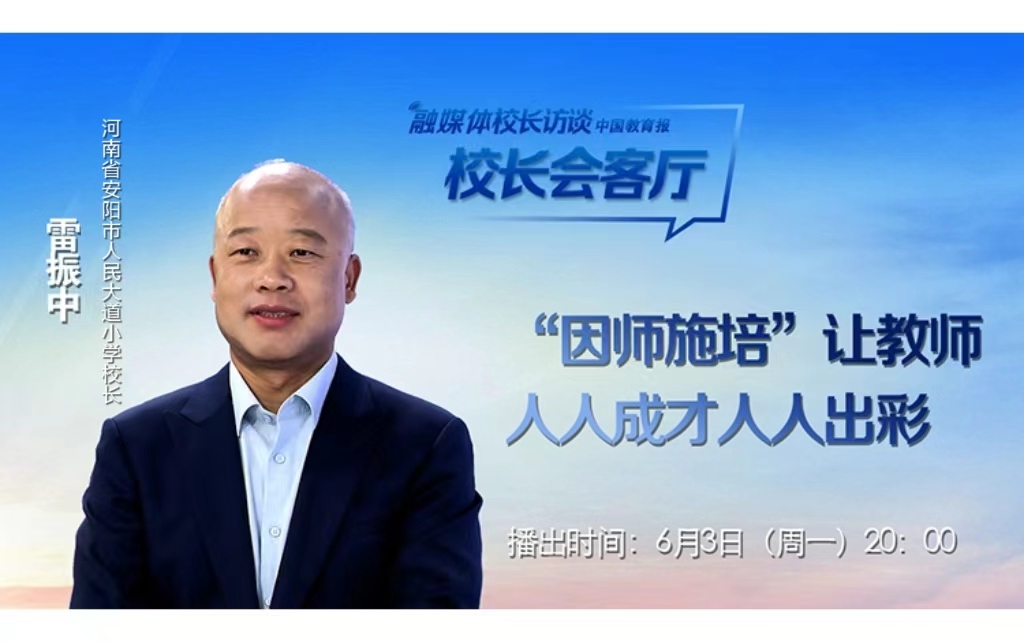 教師隊伍建設如何“因師施培”?如何幫助每位教師規劃不同的發展方向,成為更好的自己,讓教師人人皆可成才、人人皆可出彩?6月3日20:00,中國教育報融媒體校長訪談“校長會客廳”,我們邀請河南省安陽人民大道小學校長雷振中做客直播間,與大家分享人民大道小學的經驗和思考。