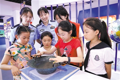 暑期,江蘇省丹陽市公安局為了解決民警因工作繁忙等無法照看子女的問題,與市教育局一起開設了包括硬筆書法、籃球、羽毛球等“警寶”暑托班。為了豐富暑托班教育形式,志愿者帶領“警寶”們走進科普體驗館,學習科普知識,享受科技知識帶來的快樂。封疆江 攝