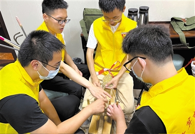 圖為暑期社會實踐團隊成員學編紅軍草鞋,感受革命艱辛。王盼 張子康 攝