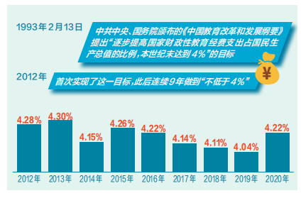 2020年,受世界百年未有之大變局和新冠肺炎疫情全球大流行交織影響,在經濟下行壓力加大、財政收支矛盾突出的情況下,我國仍然實現國家財政性教育經費支出占GDP比例4.22%,從中我們不難讀懂中國教育飛速發展背后的秘密。