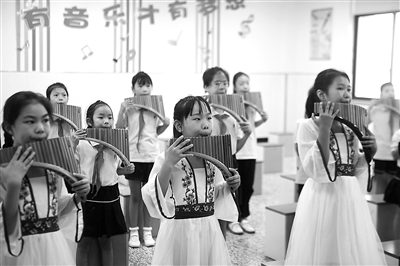 9月6日,浙江省杭州市臨安區板橋鎮板橋小學的學生在上排簫課。近年來,板橋鎮積極挖掘本土民間藝人、傳統手工業者等人才資源,引導傳統文化人才走進校園授課,助力傳統文化傳承和培養工作。新華社記者 徐昱 攝
