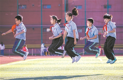 9月13日,內蒙古呼和浩特市玉泉區通順街小學學生課后在操場上進行趣味跳繩比賽。新學期開學以來,該校進一步貫徹落實好“雙減”政策,開展體育類等多種多樣的課后服務活動。丁根厚 攝