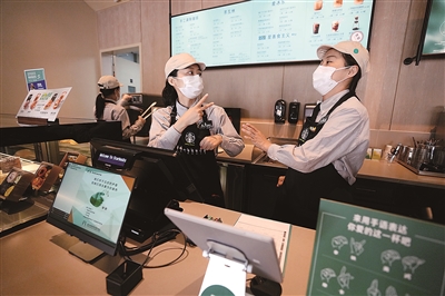 7月4日,“無聲咖啡師”公益培訓(xùn)項(xiàng)目學(xué)員、聽障咖啡師王茹(右)和聽障咖啡師李莎通過手語(yǔ)交流。每年9月的第四個(gè)周日是國(guó)際聾人日。在陜西省城市經(jīng)濟(jì)學(xué)校,新一期主要面向聽力殘疾人的“無聲咖啡師”公益培訓(xùn)正在進(jìn)行,這將為他們?nèi)蘸笤谶@一領(lǐng)域的創(chuàng)業(yè)與就業(yè)鋪平道路。新華社記者 李一博 攝