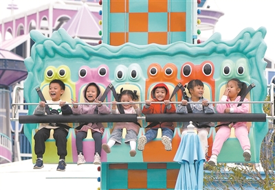 10月6日,在江西省南昌市西湖區歡樂星際樂園,孩子們體驗太空主題的游樂項目。國慶假期,人們用多種方式休閑放松,樂享假期。新華社記者 萬象 攝