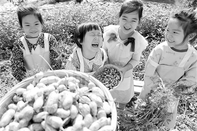 10月8日,在山東省高密市密水街道中心幼兒園,孩子們展示采摘的花生。正值寒露節(jié)氣,該園開展“花生采摘樂 萌娃慶豐收”活動,孩子們在教師帶領(lǐng)下來到校園微農(nóng)場里,拔花生、采摘花生、分享花生,感受豐收的喜悅和勞動的艱辛。