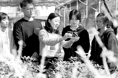 十月十日,浙江農(nóng)林大學楊琪教授(中),在該校的“平山基地”里指導專業(yè)碩士研究生觀察金絲楠木苗的生長情況。楊琪把碩士研究生的課堂搬到基地里,既解決產(chǎn)業(yè)難題、也培養(yǎng)學生的動手能力。陳勝偉 攝