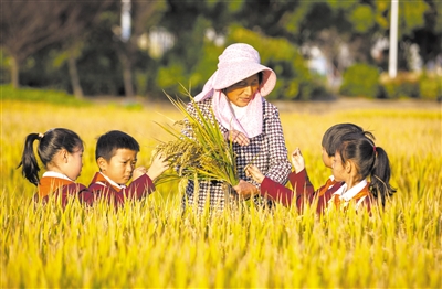 近日,江蘇省海安高新區(qū)實驗小學(xué)的學(xué)生走進(jìn)水稻田,聽教師和農(nóng)民講解有關(guān)水稻種植知識。眼下水稻進(jìn)入收獲期,海安高新區(qū)實驗小學(xué)把課堂搬到田間,讓學(xué)生了解種糧的艱辛,分享豐收的喜悅,培養(yǎng)學(xué)生愛護(hù)糧食、樹立“粒粒皆辛苦”的節(jié)約意識。翟慧勇 攝
