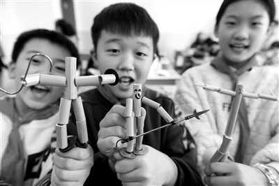 近日,安徽省阜陽市潁東區育新小學潁河校區學生在教室內展示自己動手制作的“竹節人”。該校區結合課文《竹節人》,組織學生分成興趣小組,找來竹節、細繩、瓶蓋、小刀以及彩筆等工具,自己動手制作“竹節人”,讓孩子們“學中做”“做中學”,以靈活教學方式助力“雙減”。王彪 攝