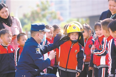 11月8日,在浙江省湖州市德清縣武康街道機(jī)關(guān)幼兒園,消防員指導(dǎo)小朋友試戴滅火救援頭盔。德清縣消防救援大隊(duì)聯(lián)合機(jī)關(guān)幼兒園開(kāi)展“119”消防主題活動(dòng),小朋友通過(guò)體驗(yàn)滅火器的使用、參觀消防器材裝備、參與火災(zāi)疏散演練等方式,提升消防安全意識(shí),增強(qiáng)自我保護(hù)能力。