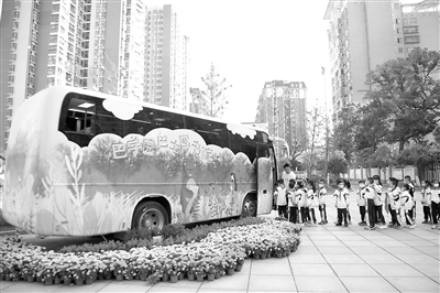 11月10日,湖南省長沙市青園友誼小學的學生排隊進入巴士圖書館。近日,青園友誼小學的巴士圖書館開館,吸引學生們前來閱讀、體驗。巴士圖書館由一臺廢棄巴士改造而成,目前共藏書4000多冊。