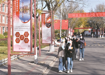 為深入貫徹學習黨的二十大精神,山西師范大學精心打造了約150米長的主題思政文化街,由20余個沉浸式研學黨的二十大精神條幅和120個呈現新時代十年輝煌成就的圖片展板組成,以最直觀的方式呈現黨的二十大精神,激發青年學生的思想共感、共情、共鳴。圖為近日師生前來學習觀看。饒北成 攝
