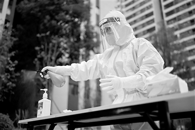 近日,在重慶市高新區虎溪街道學成社區一小區,重慶醫科大學疫情防控第39志愿隊的志愿者正在進行消毒。該志愿隊由53名碩士、5名博士研究生志愿者組成,參與虎溪街道的疫情防控工作。孫凱芳 攝