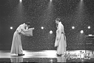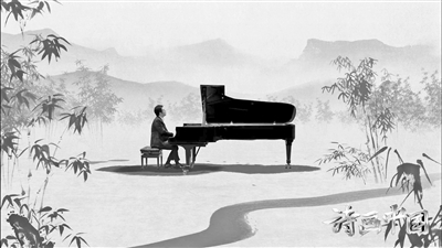 新境之“新”首先體現在傳統文化與多種藝術形式的融合。整檔節目沒有設置固定的形式標簽,而是量體裁衣,為每一幅畫尋找最確切的表達方式。節目全面融合了歌曲、舞蹈、戲劇、曲藝等多種樣態,融入京劇、評彈、武術、朗誦、音樂劇、肩上芭蕾、木偶劇、鋼琴、琵琶等多重藝術手段,真正打造出一場底蘊深厚、古今交融的文化盛宴,一座審美多元、形式多樣的藝術殿堂。如在展現馬遠作品《水圖》時,任敏、王西、陳添以一曲水下舞蹈,再現了畫家筆下的十二種水形、水意,最終創造出“上善若水”的唯美意境。再如,展現明代畫家徐渭筆下的《雜花圖》時,鋼琴家郎朗置身水墨場景中,與樂隊一同用數字化“水墨交響”的形式,在黑白琴鍵與水墨之間呈現出“等量齊觀”的文化哲思。