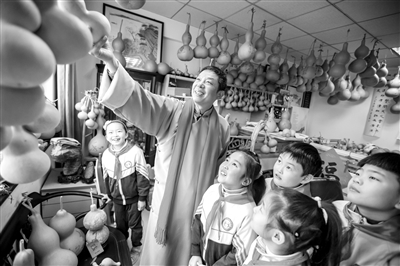 日前,江蘇省海安市教師發展中心附屬小學的孩子們在聽“非遺”傳承人介紹“葫蘆烙畫”技藝。該校組織學生探訪當地“葫蘆烙畫”傳承人,了解和體驗“葫蘆烙畫”技藝,感受中國傳統文化藝術的魅力。