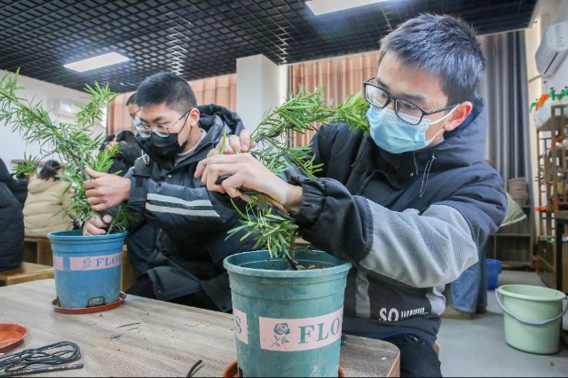 近日,在江蘇省如皋市第二中學,學生在學習非遺如皋盆景制作技藝。自“雙減”政策實施以來,該校聯合如皋市文化館共同建設“非遺課程基地”,豐富學生校園生活,促進學生健康成長。徐慧 攝