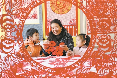 圖①2022年12月30日,山東高密非遺傳承人田桂芹帶領孩子們進行迎新年剪紙創作。通訊員 李海濤 攝